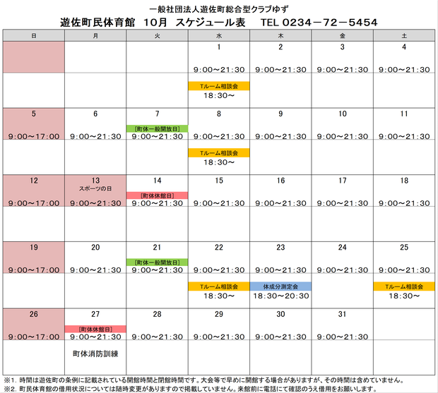令和7年度遊佐町民体育館の一般開放日・休館日です。